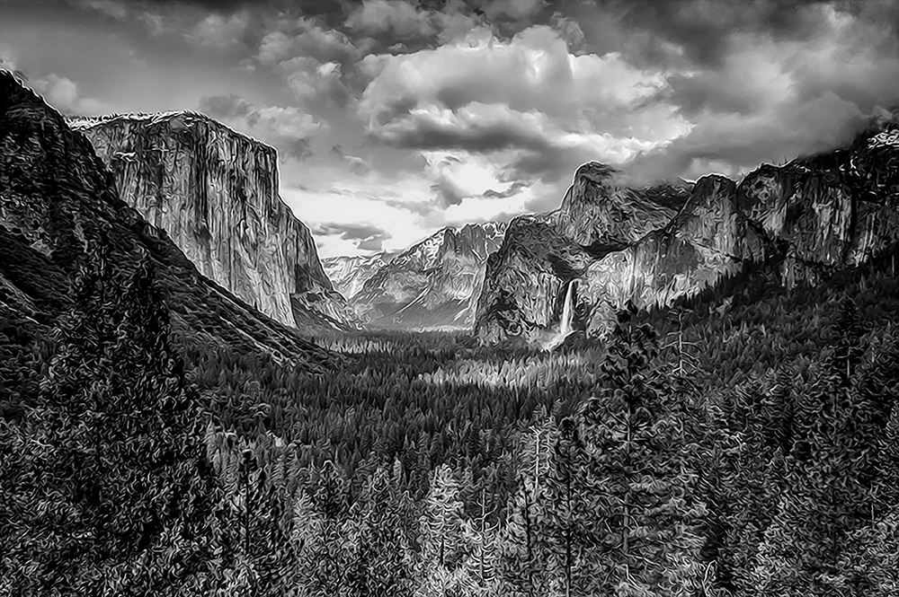 Tunnel View 03/24/2006 Oil Paint Rendered BW –Yosemite National Park, California