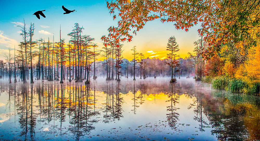 This beautiful photograph is so calming and a treat to my senses, from the birds above to the lake and mist below.