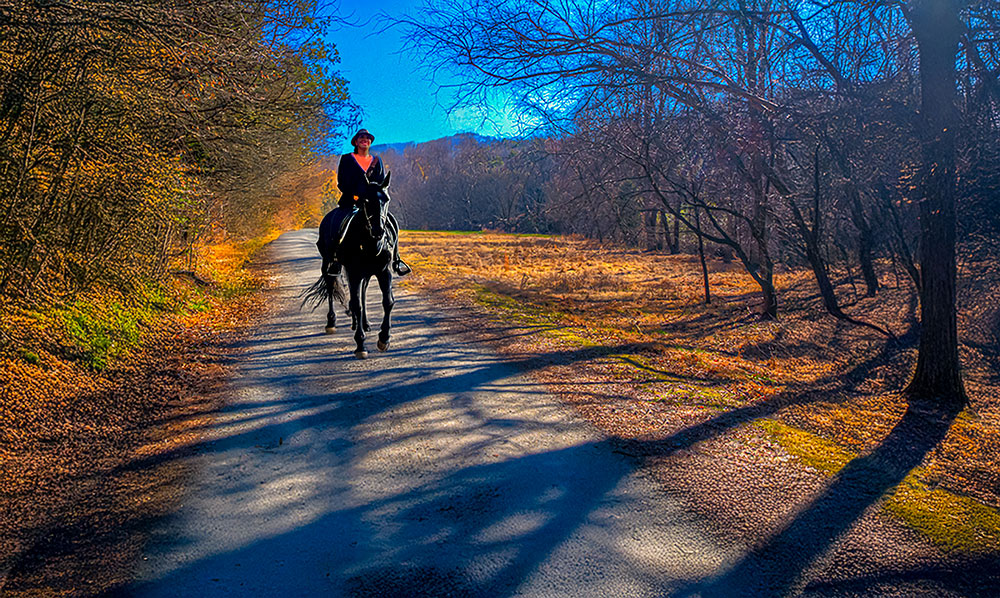 PS — The Woman on a Black Horse goes with me everywhere and is in every photograph I take, though she is invisible to everyone but me and my Psyche. She IS my Psyche–My symbol of my Psyche. And she is in the photographs I take for this site by way of Photoshop’s AI tool, Generative Filter, to whom I can say, “Give me a woman on a black horse,” and show it where in the image I want her to appear, and keep making the request until I am given an image that I like. –JD